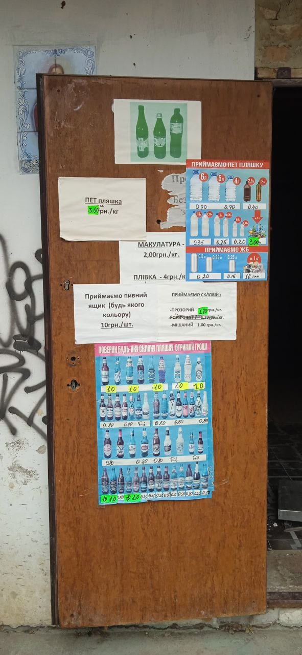 скло, макулатура, ПЕТ пляшки, плівка, пластикові ящики від пляшок пива, алюмінієві банки